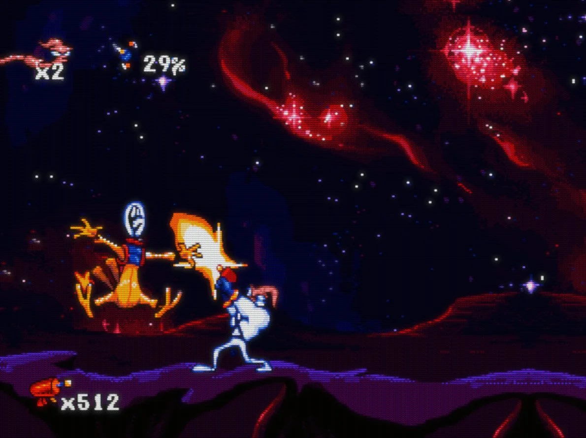 Earthworm Jim offers a wide variety of platforming mechanics and level designs that are just about as creative as they come from that era of gaming. You have two primary weapons to dispatch enemies in the game, your trusty plasma gun and your worm body, which you use as whip. You also use your worm body as means for traversal, latching onto hooks to swing your way across gaps or by rapidly tapping the jump button to helicopter yourself and slow your descent.